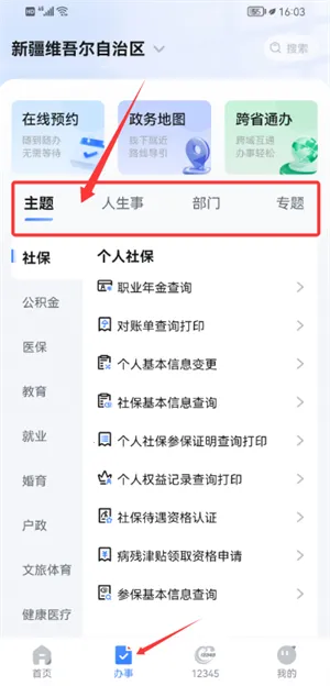4、通过办事页面,可按主题分类查找社保等相关所需政务服务。