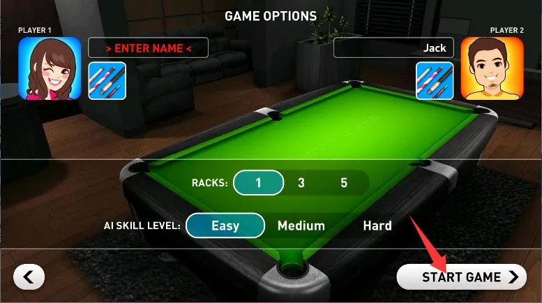 1、高精度物理引擎:模拟台球运动轨迹,真实还原球体碰撞与旋转效应,支持拉杆与跳球等专业击球技巧。
