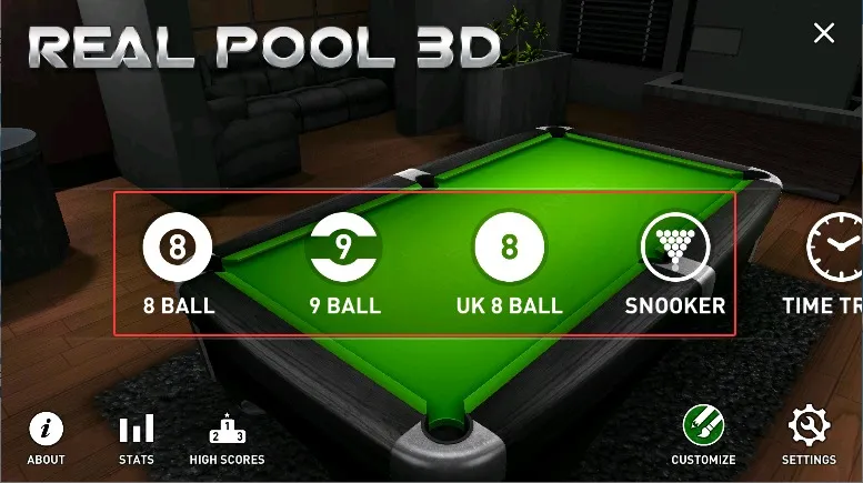 2、多规则竞技体系:涵盖美式8球与英式斯诺克等五种经典玩法,每种模式有独立计分规则与胜负条件。