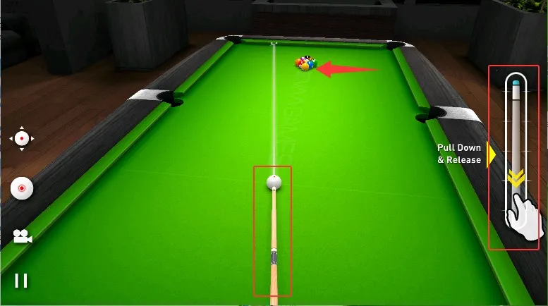 4、滑动屏幕调整击球方向,右手控制击球力度条,瞄准目标球后完成精准击打操作。